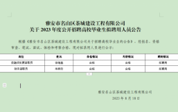 雅安市名山區(qū)茶城建設(shè)工程有限公司系雅安市名山區(qū)區(qū)屬一級(jí)國有企業(yè),成立于2018年10月,注冊資本金25000萬元,主要經(jīng)營范圍為對土地、城市資源等領(lǐng)域及保障性住房、房地產(chǎn)開發(fā)、城市基礎(chǔ)設(shè)施、公共服務(wù)設(shè)施等進(jìn)行經(jīng)營管理;并開展項(xiàng)目投資、工程管理服務(wù)、園林綠化、環(huán)境治理工程、土地整理和各類工程建設(shè)活動(dòng)等。根據(jù)公司2023年人員招聘計(jì)劃,茶城公司擬面向社會(huì)公開招聘3名工作人員。現(xiàn)將有關(guān)事項(xiàng)公告如下:一、報(bào)名條件(一)招錄崗位、名額及招錄資格條件(見附表)(二)基本條件1.本科及以上學(xué)歷、學(xué)士及以上學(xué)位。包括2023年應(yīng)屆高校畢業(yè)生;2022年、2021年未參加工...
