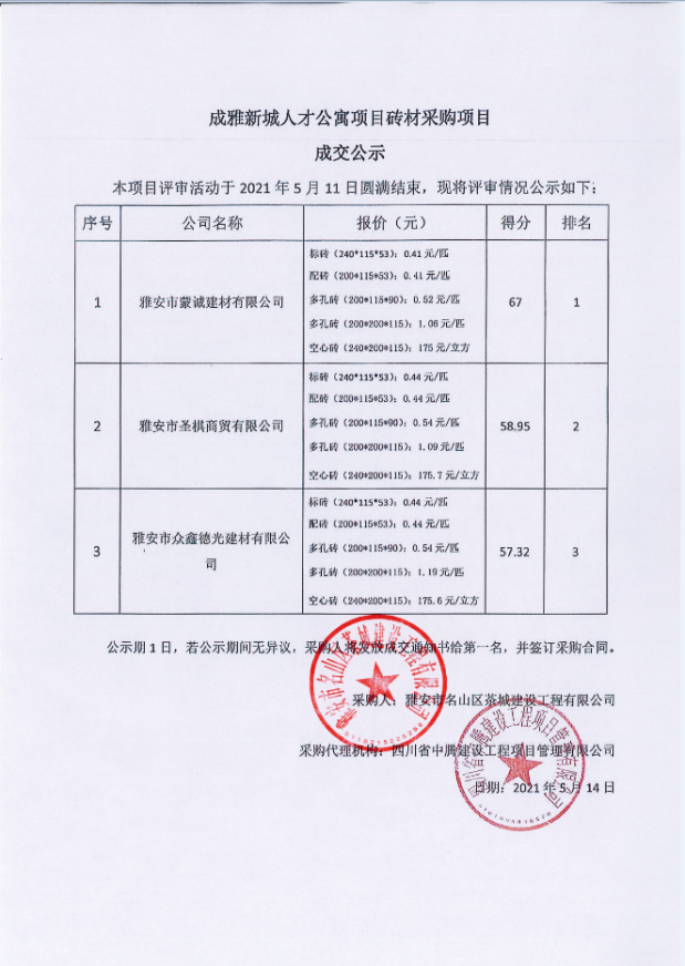 成雅新城人才公寓項目磚材采購成交公示
